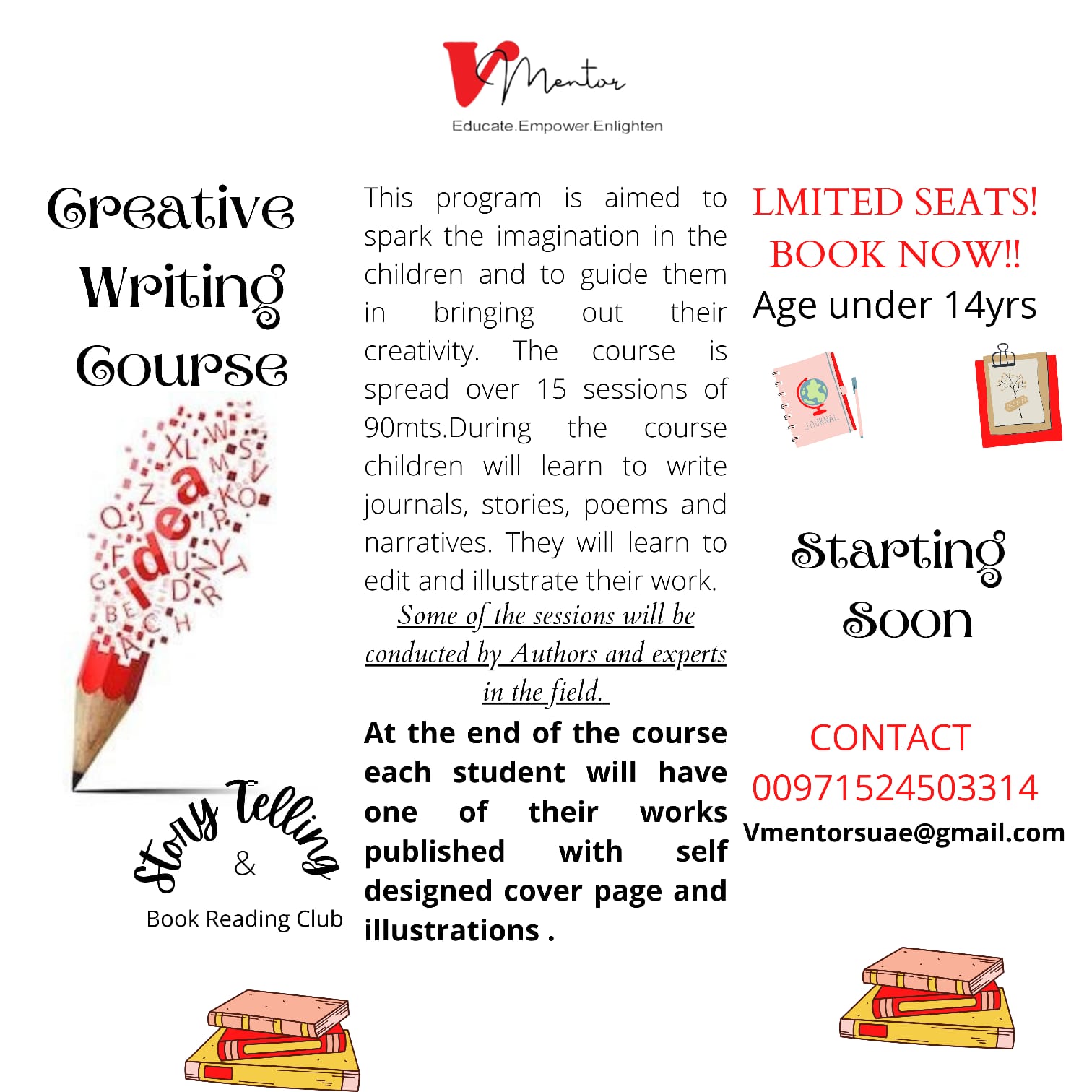 Enrol your kids in our online Creative Writing Workshop tailored for ages 7 to 12. Over the course of 12 weeks, every Friday from 3 PM to 4:30 PM (UAE time), they’ll embark on a magical journey into the world of writing.